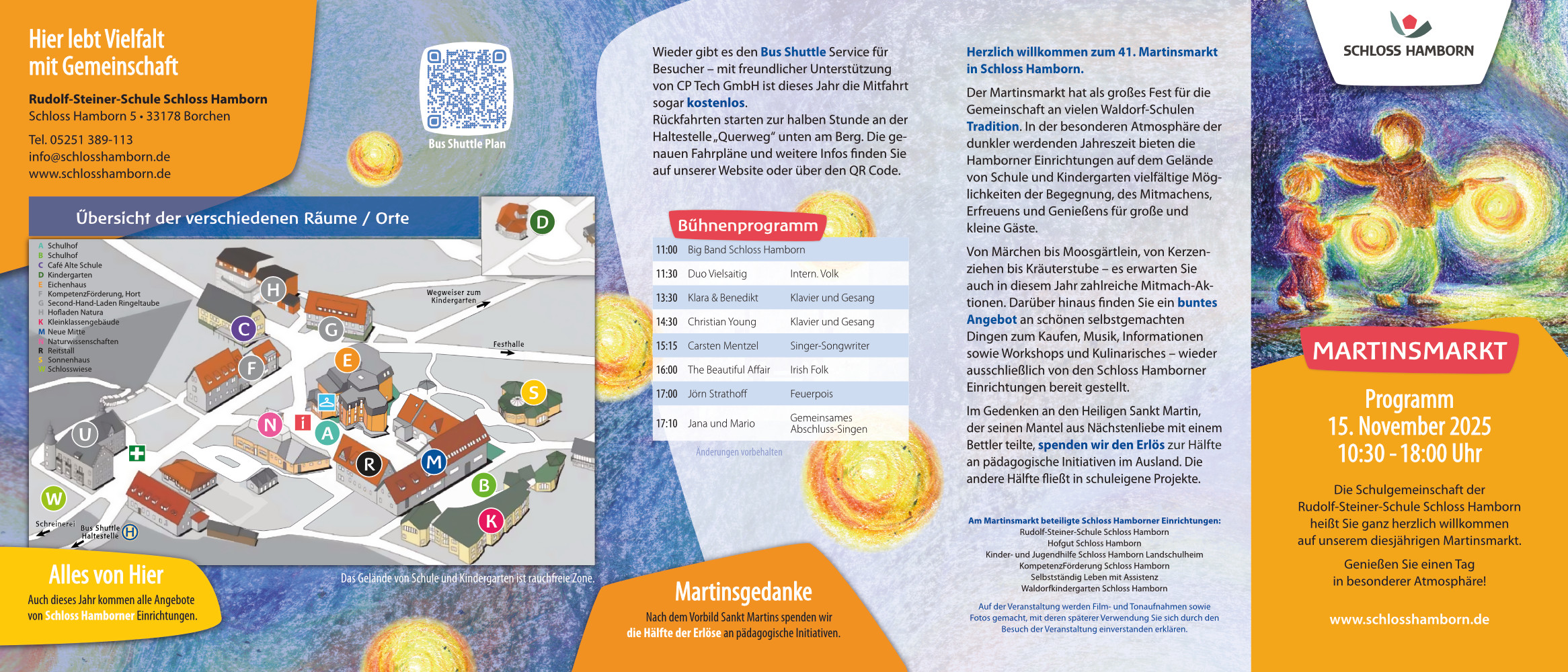 Die Schulgemeinschaft der Rudolf‐Steiner‐Schule Schloss Hamborn lädt am Samstag, den 15. November 2025 zum traditionellen Martinsmarkt ein. Von 10.30 – 18.00 Uhr stehen auf dem Gelände von Schule und Kindergarten wieder zahlreiche Angebote zum Mitmachen, Erfreuen und Genießen bereit.