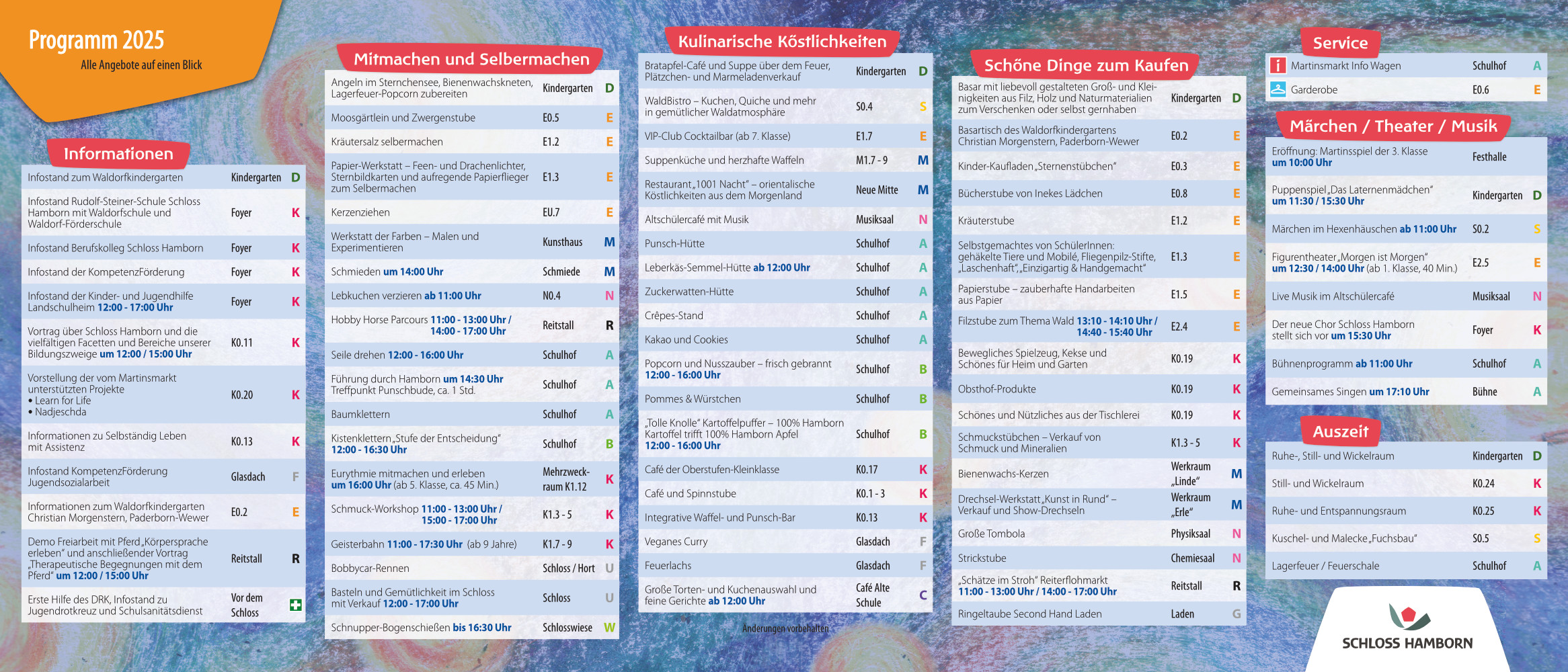 Traditionell eröffnet wird der Markt um 10.00 Uhr mit dem Martinsspiel der 3. Klasse in der Festhalle in Schloss Hamborn. Im Anschluss öffnen die vielfältigen Angebote für kleine und große Gäste. Neben den beliebten Angeboten der Schulklassen wie z.B. Moosgärtlein, Kerzenziehen, Puppenspiel, Kräuterstube, Cocktailbar oder Hexenhäuschen stehen wieder zahlreiche Mitmachangebote und Stände der Hamborner Einrichtungen bereit. Auch in diesem Jahr gibt es ein Bühnenprogramm mit Musik und Unterhaltung.